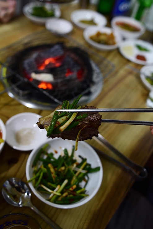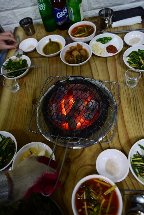 준비된 숯불과 석쇠에 고기를 각 한점씩 올려 봅니다.
